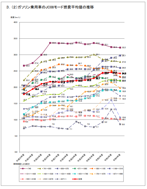 JC08モードは令和3年から令和4年にかけて燃費平均値が下がっていますが、WLTCモードでは上昇傾向にあります。WLTCモードで測定されること前提とした燃費向上に関する技術開発が進んでいるのかもしれません。